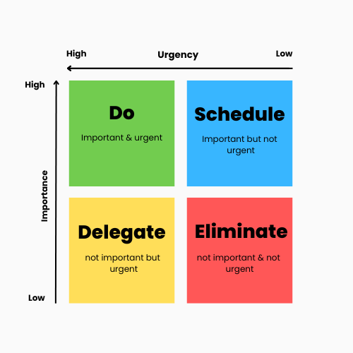 The Eisenhower Matrix, also referred to as Urgent-Important Matrix, helps you decide on and prioritize tasks by urgency and importance, sorting out less urgent and important tasks which you should either delegate or not do at all.